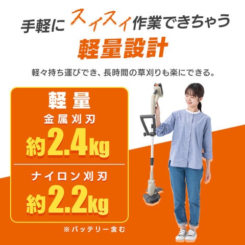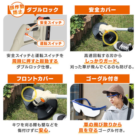 ・安全カバー:高速回転する刃からしっかりガードし、刈った草が飛んでくるのも防げます。