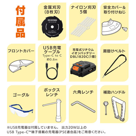 充電式リチウムイオンバッテリー(型番:DBL1820C)、USB充電ケーブル(Type-C to C)、金属刈刃、フロントカバー、安全カバー、六角レンチ、ボックスレンチ、ゴーグル、肩掛けベルト、ナイロン刈刃×5、補助ハンドル