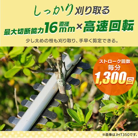 “最大切断能力:直径約16mm×高速回転(ストローク回数毎分1300回)”で、少し太めの枝も刈り取り、手早く剪定できます。
