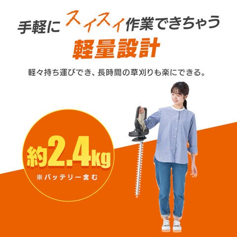 “刈り込み幅:約530mm”のロングブレードで、広範囲を一気に刈り取れます。