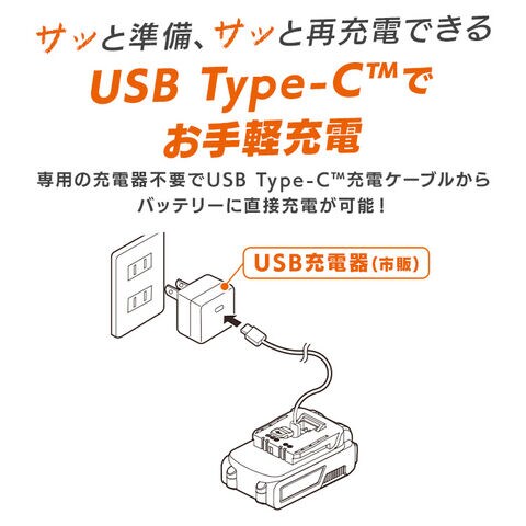 充電式リチウムイオンバッテリー(型番:DBL1820C)、USB充電ケーブル(Type-C to C)