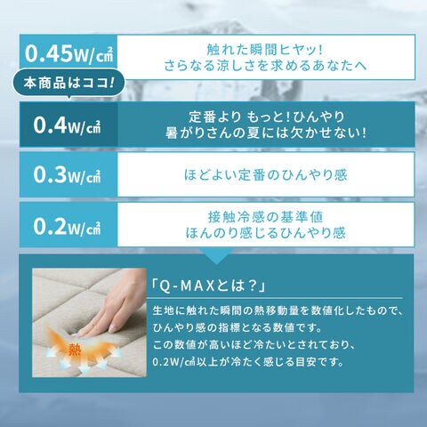 [Q-MAXとは:生地に触れた瞬間の熱移動量を数値化したもので、ひんやり感の指標となる数値。この数値が高いほど冷たいとされており、0.2W/cm2以上が冷たく感じる目安。]