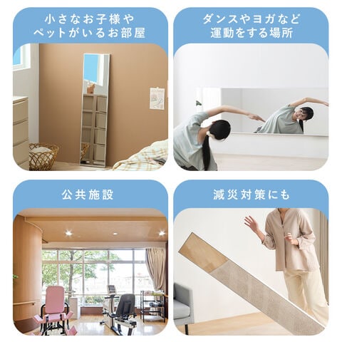 ガラス不使用のフィルムミラーだから割れることがなく、さまざまなシーンで安心して設置できる。