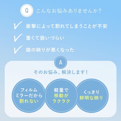 ガラス不使用のフィルムミラーだから割れることがなく、さまざまなシーンで安心して設置できる。