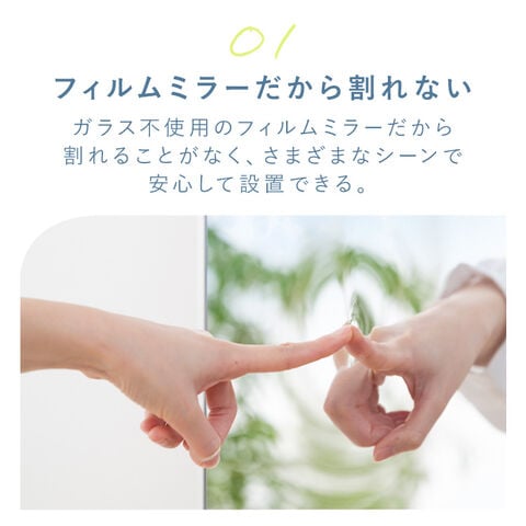 ガラス不使用のフィルムミラーだから割れることがなく、さまざまなシーンで安心して設置できる。