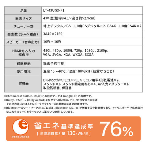 テレビ 液晶テレビ 43型 43V型 4K インターネット対応 スマートテレビ GoogleTV チューナー内蔵 動画配信サービス 音声検索 音声操作 Wチューナー 裏番組録画 tv 43 LT-43UGX-F1 ブラック