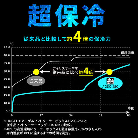 (※本体容量40%相当の氷を入れ、底面温度が8℃に達するまでの時間。環境温度:30℃→9時間・20℃→15時間の繰り返し。)