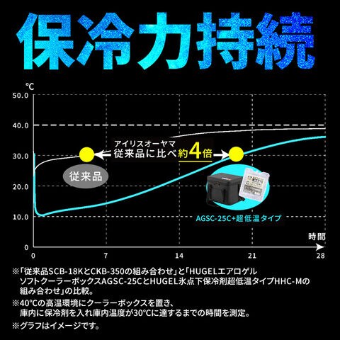 (※本体容量40%相当の氷を入れ、底面温度が8℃に達するまでの時間。環境温度:30℃→9時間・20℃→15時間の繰り返し。)