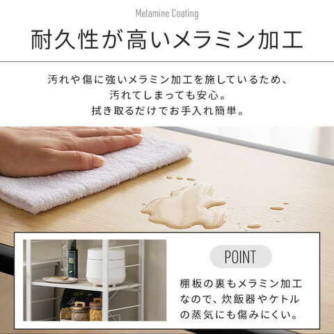 棚板は汚れやキズに強いメラミン加工を施しているため、汚れてしまっても拭き取るだけで簡単にお手入れができます。