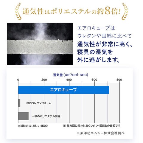 エアロキューブはウレタンや固綿に比べて通気性が非常に高く、寝具の湿気を外に逃がします。