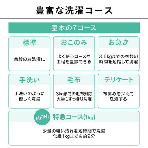 タイパにこだわった『特級コース』搭載!化繊約1kg(ワイシャツ・下着類2着分)を約9分で洗濯可能!