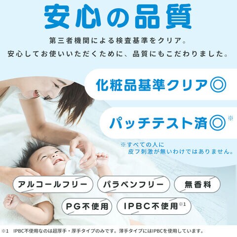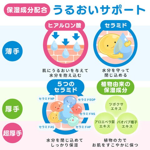 ・厚手/超厚手:5種のセラミド(セラミドNP/NS/AS/EOP/AP)と植物由来の保湿成分(バオバブ種子油、ツボクサエキス、アロエベラ葉エキス)を配合。