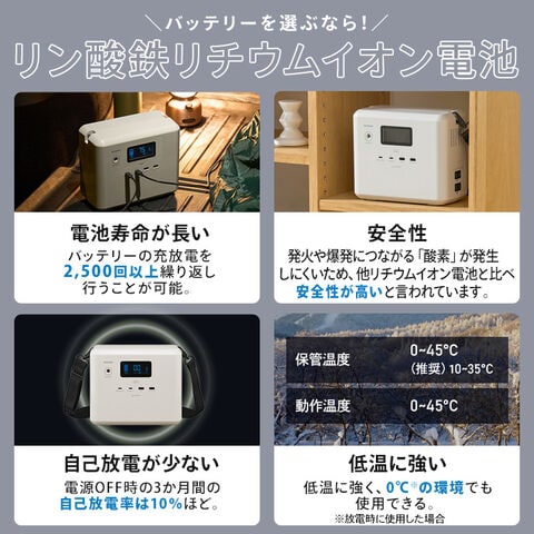 リン酸鉄リチウムイオンバッテリーを搭載し、一般的なリチウムイオンバッテリーの約3~5倍の寿命があります。(充電サイクル数:2500回以上)