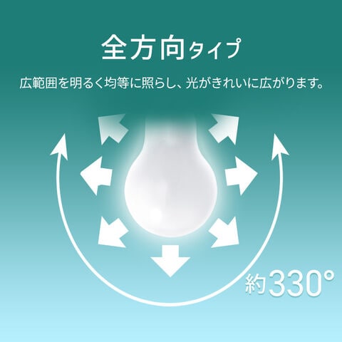 330°に明るい全方向タイプなので、ダウンライト・ブラケット・ペンダント・浴室灯や屋外玄関灯※などの照明に最適です。