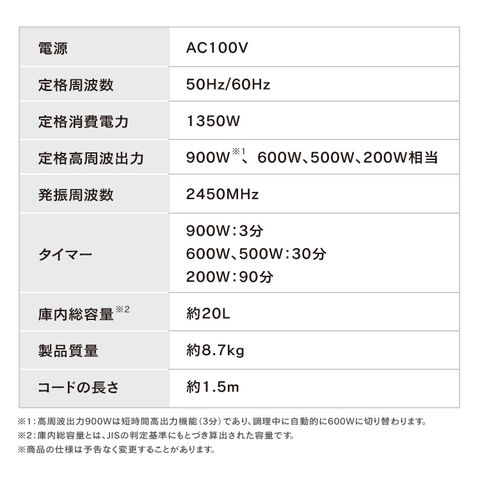 ※1 高周波出力900Wは短時間高出力機能(3分)であり、調理中に自動的に600Wに切り替わります。
