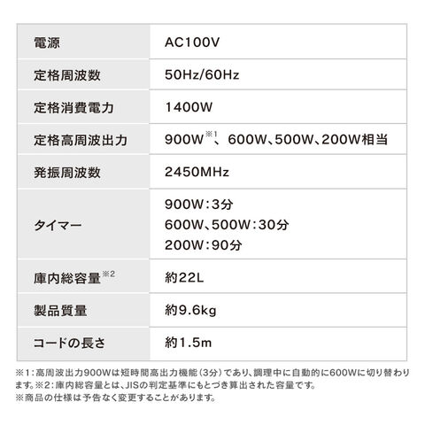 ※1 高周波出力900Wは短時間高出力機能(3分)であり、調理中に自動的に600Wに切り替わります。