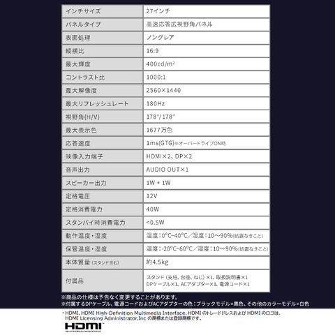スタンド(支柱・台座・ねじ)、取扱説明書、DPケーブル、ACアダプター、電源コード
