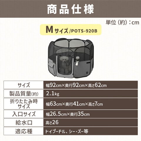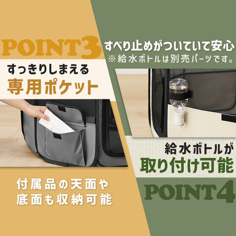 給水ボトル取り付け用のゴムには滑り止めがついており、飲み口の高さは各適応犬種の体高に合わせています。 ※給水ボトルは別売です