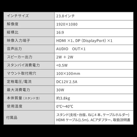 スタンド(支柱、台座、ねじ4本、ケーブルホルダー)、HDMIケーブル(1.5m)、ACアダプター、取扱説明書