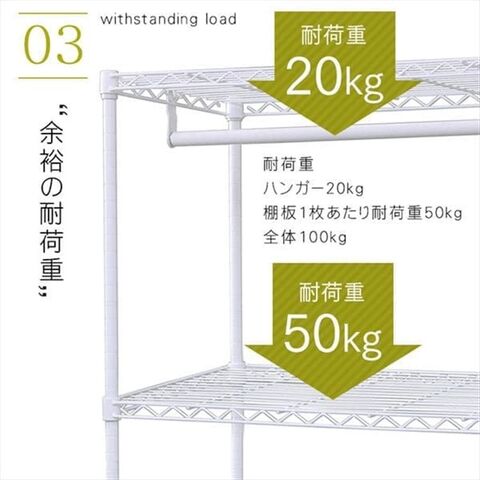 棚板1枚あたり耐荷重約50kg、ハンガー約20kg、全体約100kg!