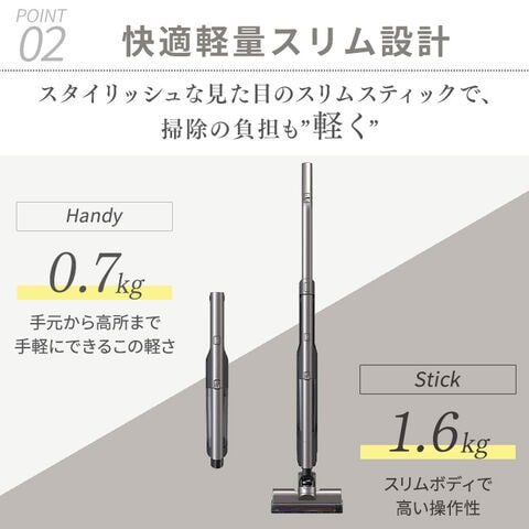 ワンタッチでハンディになり、手軽に使用できる充電式スティッククリーナーです。