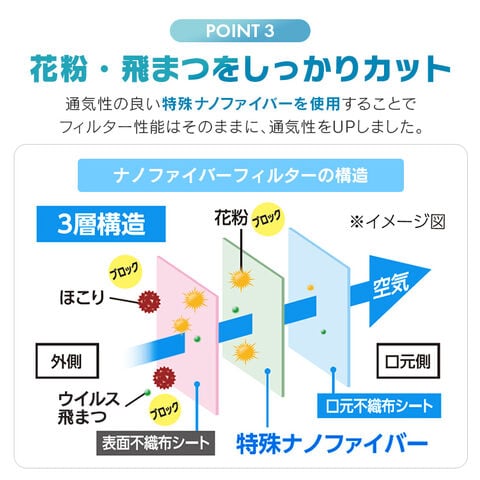 ナノファイバー加工の中間層を採用し、通気性を保ちながらウイルス飛沫の侵入を防ぎます。