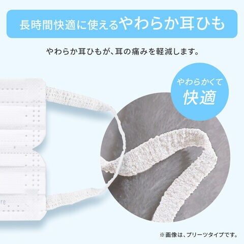 長時間装着しても耳が痛くなりにくい、ふんわりやわらかい幅広耳ひもを採用しています。