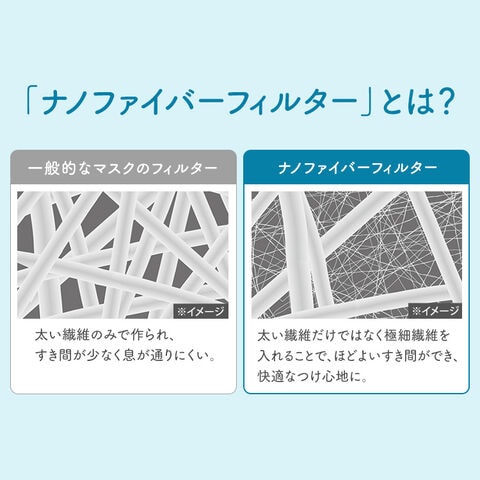 高い捕集性能と通気性を持つナノファイバーフィルターをマスク本体部に採用しているため、着用時の口元温度上昇を緩和して蒸れによる不快感を軽減します。