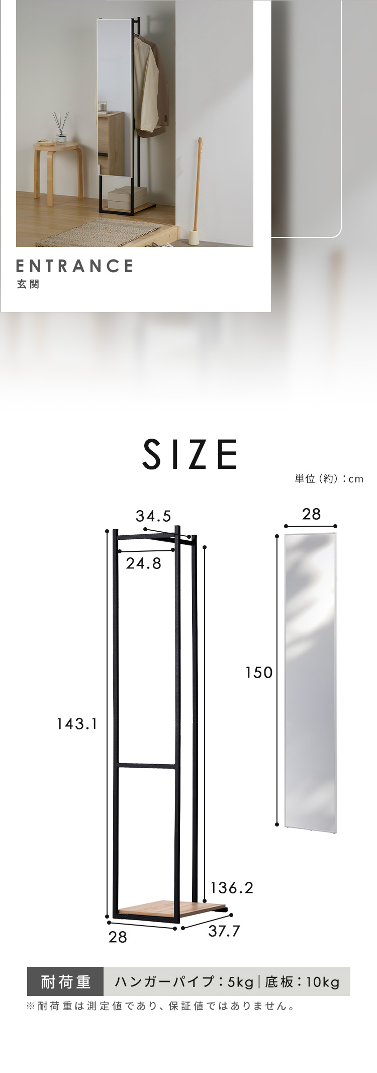 スリムハンガーラック HSPI-280 ナチュラル/ブラック+軽くて割れないフィルムミラー マグネットタイプ KWM-28150M シルバー