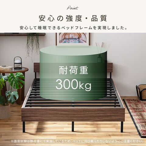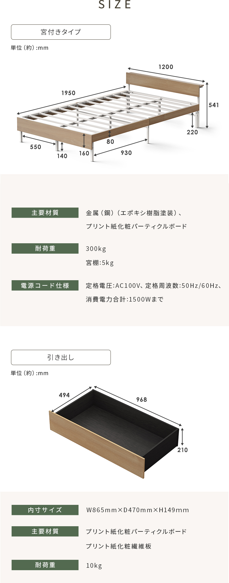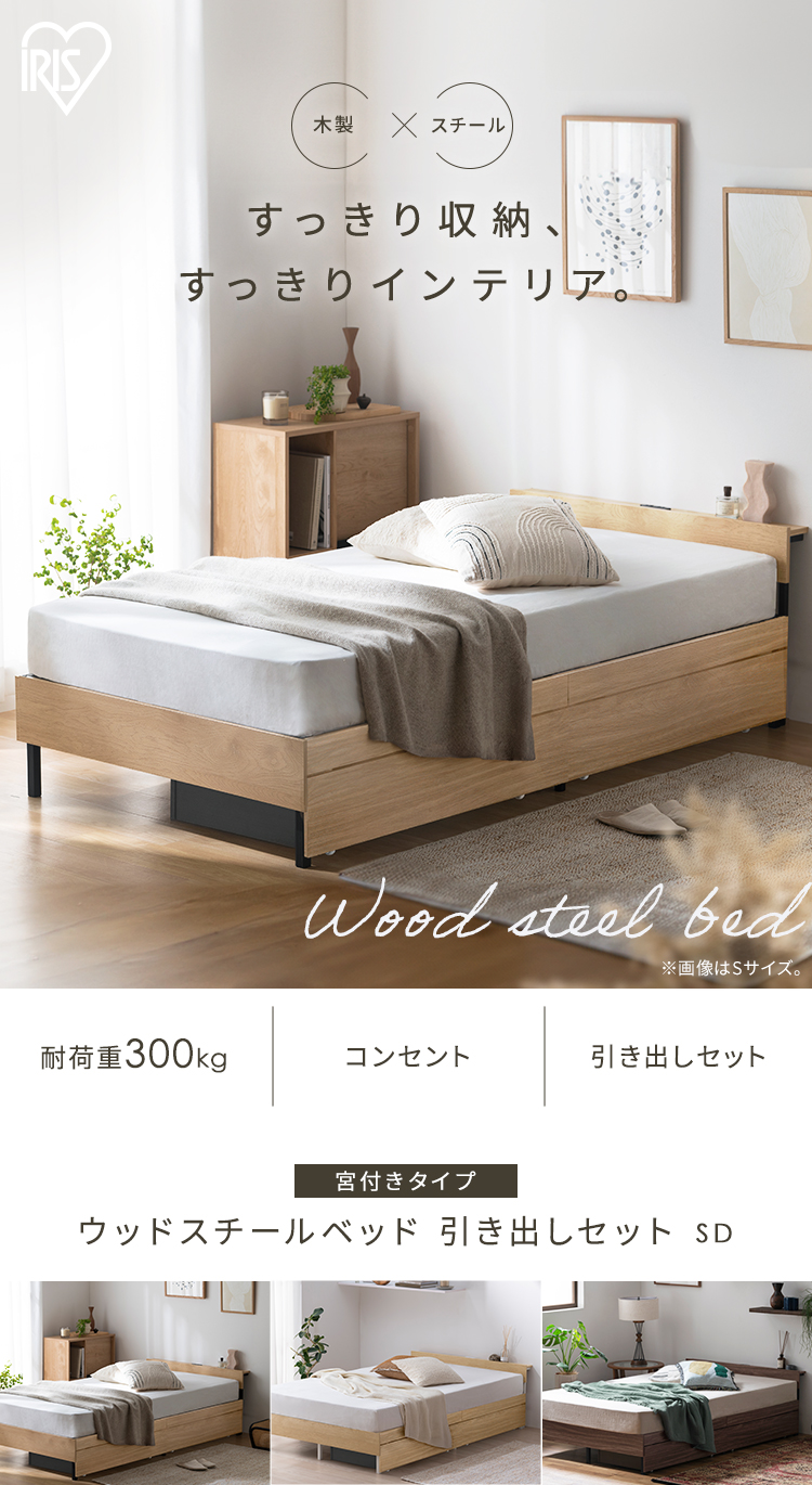 ウッドスチールベッド セミダブル 宮付き 引き出しセット