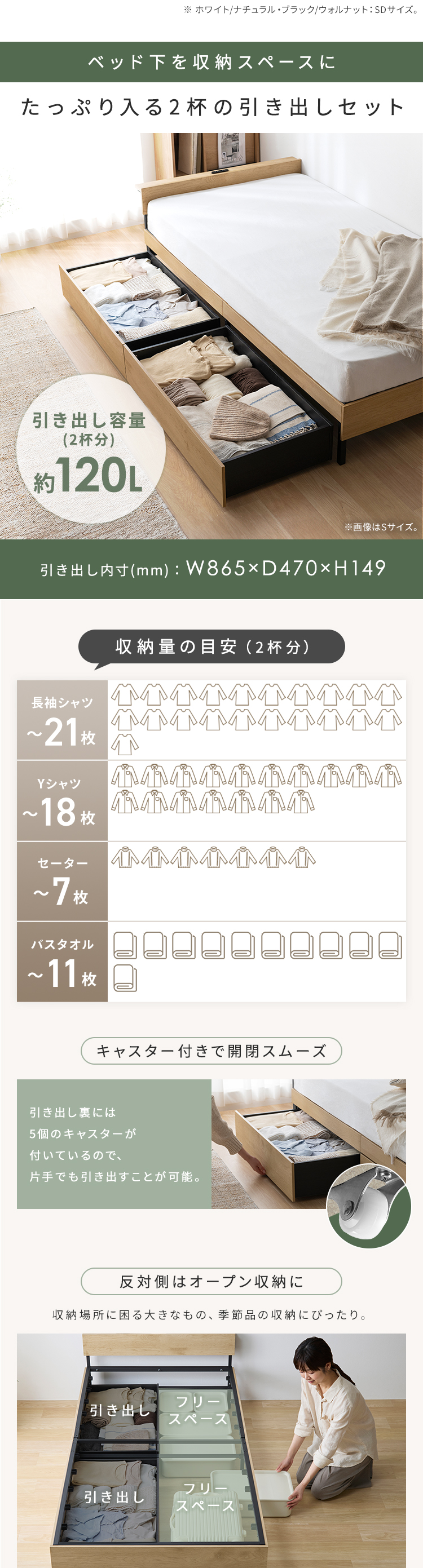 ウッドスチールベッド 引き出しセット 宮付き ダブル SBW02-D/SB-WHK ブラック/ナチュラル