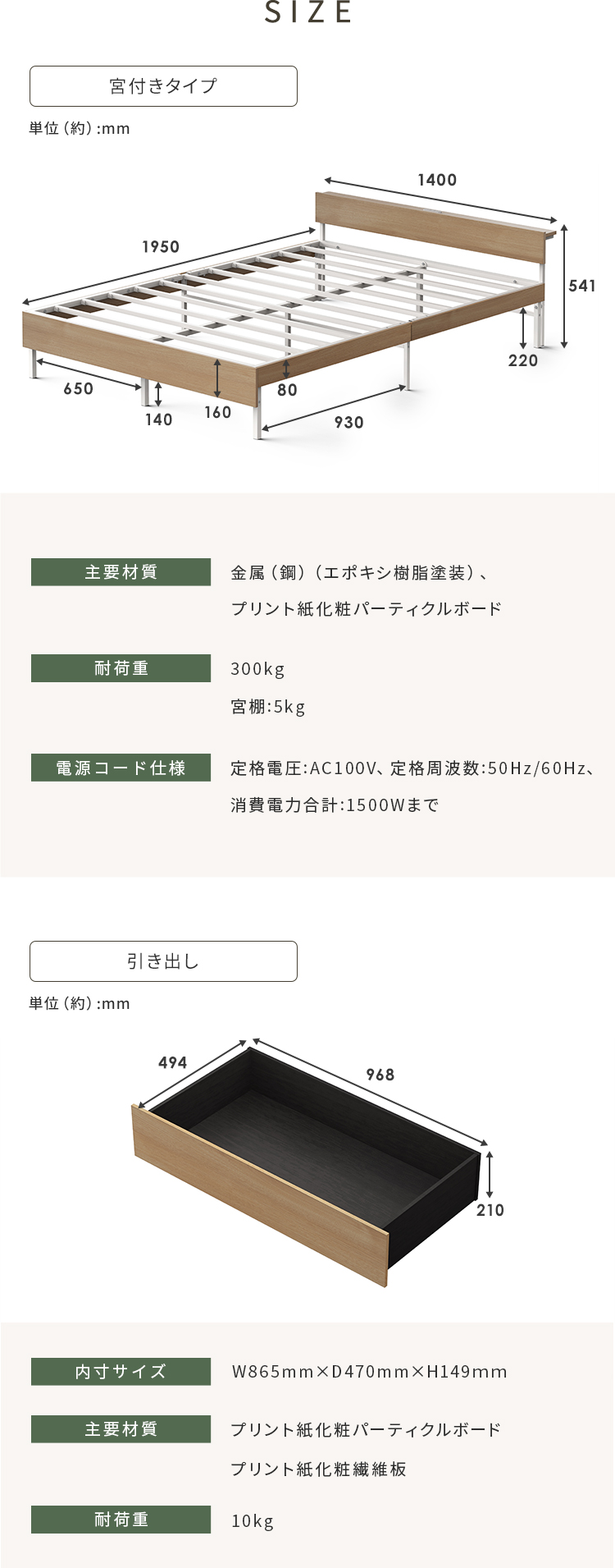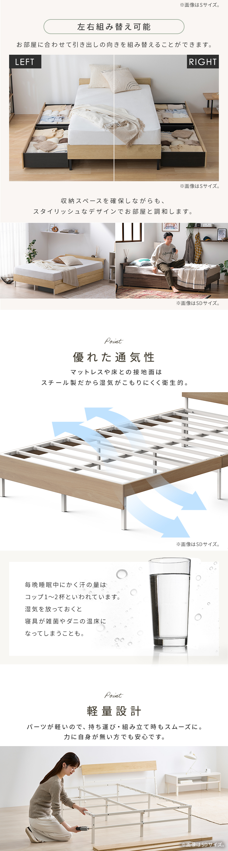 ウッドスチールベッド ダブル 宮付き 引き出しセット