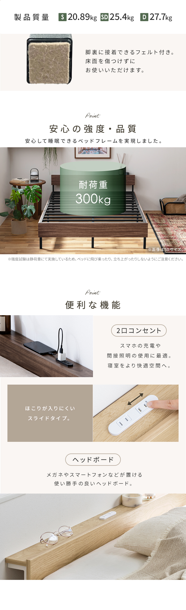 メガネやスマートフォンなどが置ける使い勝手の良いヘッドボード。
