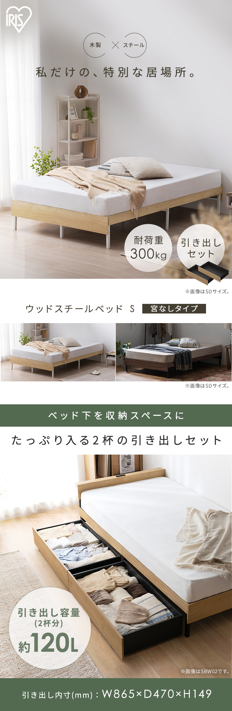 木製×スチールウッドスチールベッド シングル 宮なし 引き出しセット