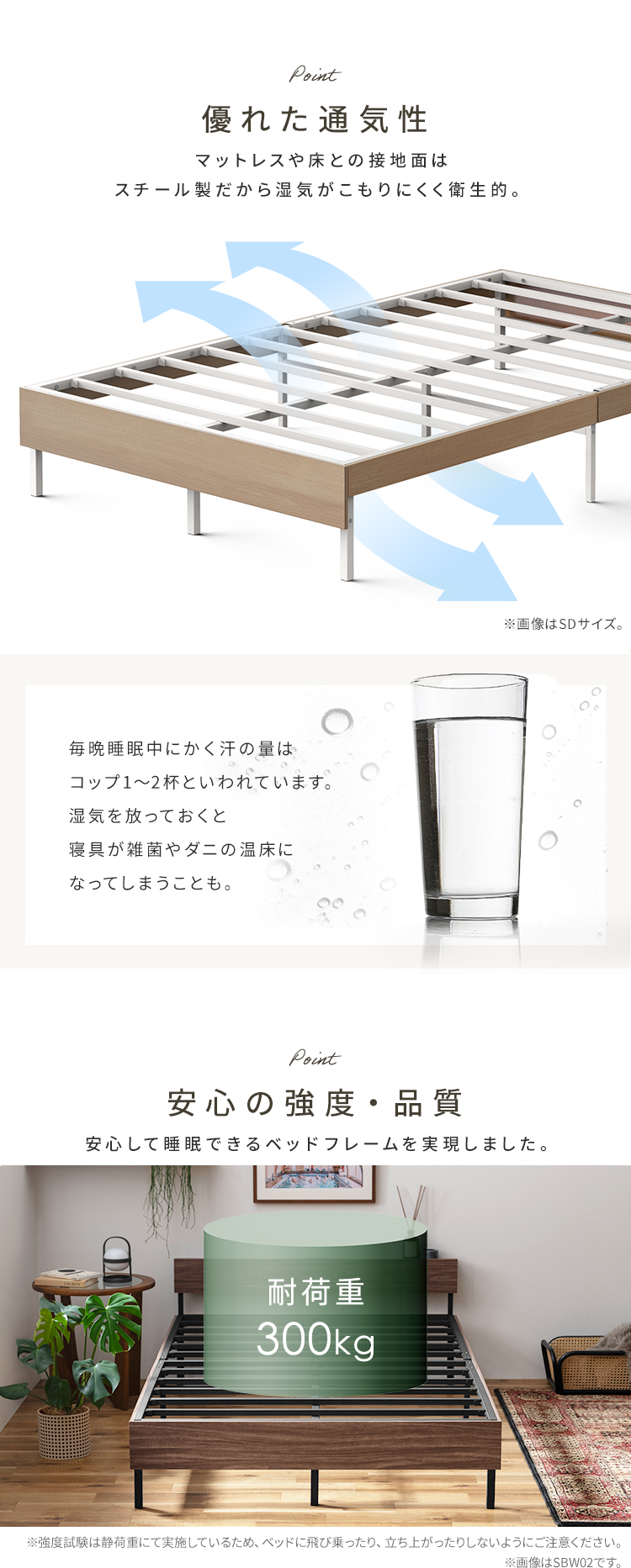 マットレスや床との接着面はスチール製だから湿気がこもりにくく衛生的。