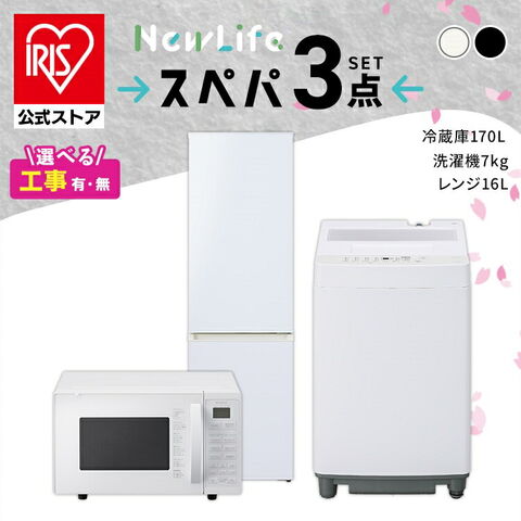 スペパ 家電セット 3点セット冷蔵庫 170L 洗濯機 7kg オーブンレンジ 16L 一人暮らし 冷凍冷蔵庫 アイリスオーヤマ 新生活 ナチュラルホワイト