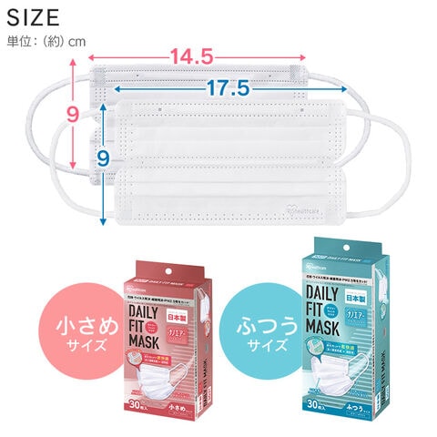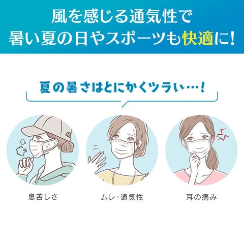・PN-DNI30:丸くやわらかい耳ひも採用で長時間つけていても耳が痛くなりにくく、マスク中央の3Dワイヤーが口元にゆとりのある形状を保つため呼吸がしやすい。