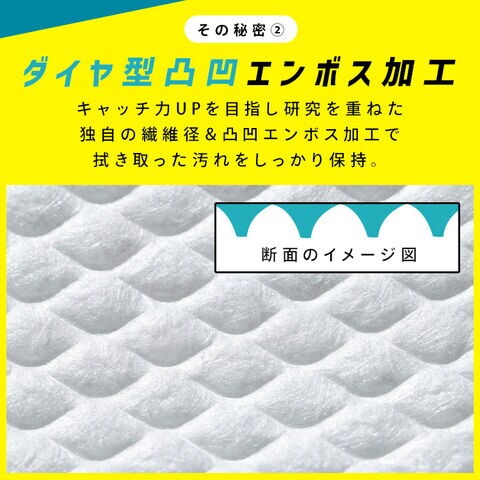 キャッチ力UPを目指し研究を重ねた独自の繊維径&凹凸エンボス加工でふき取った汚れをしっかり保持。