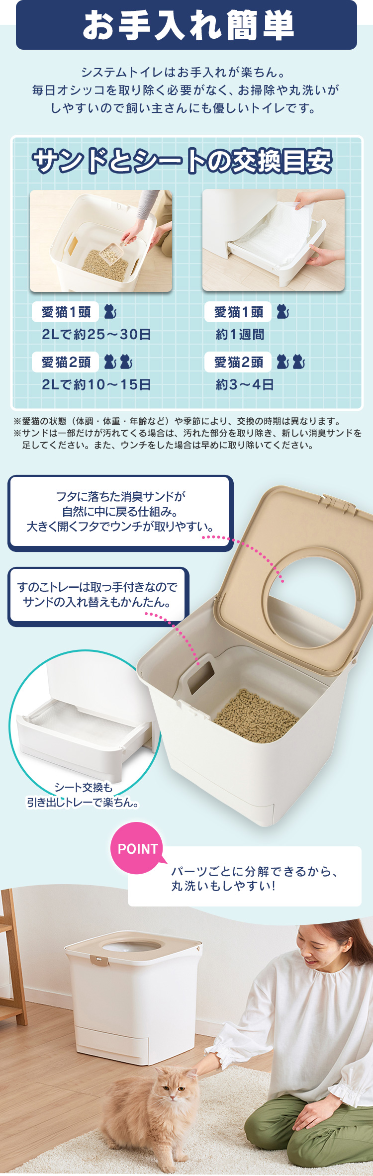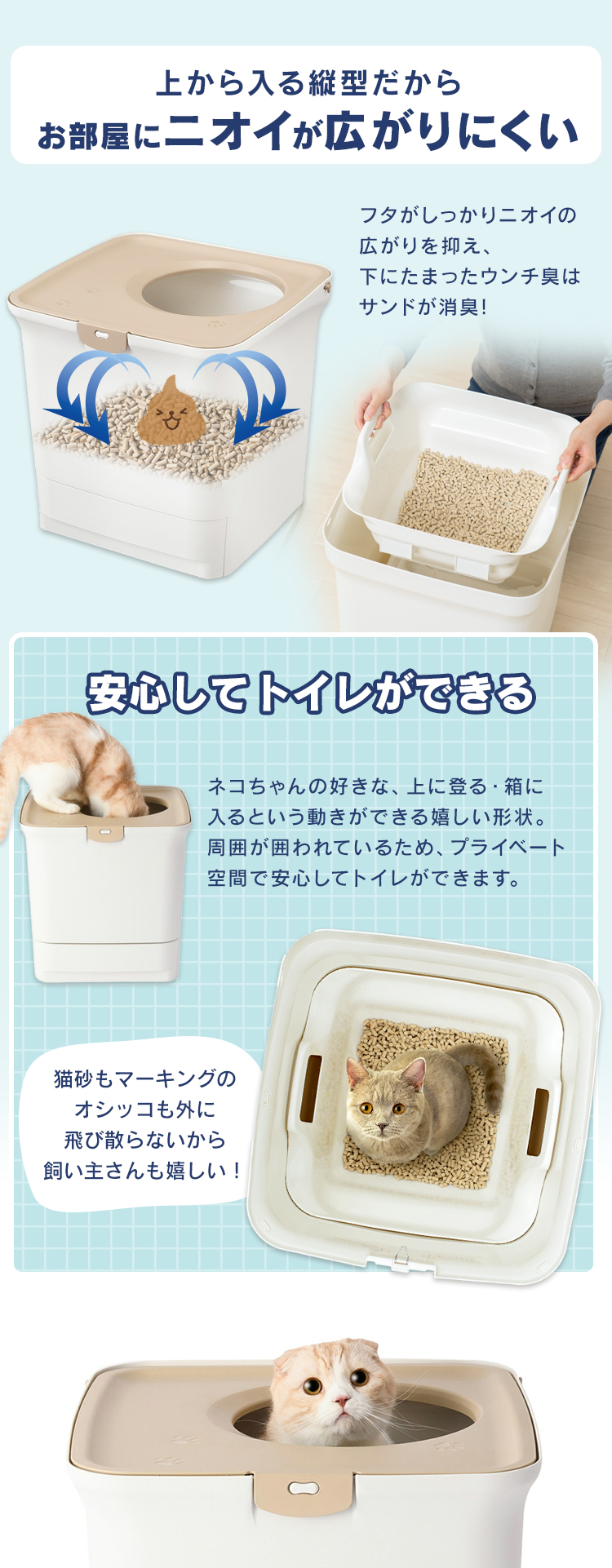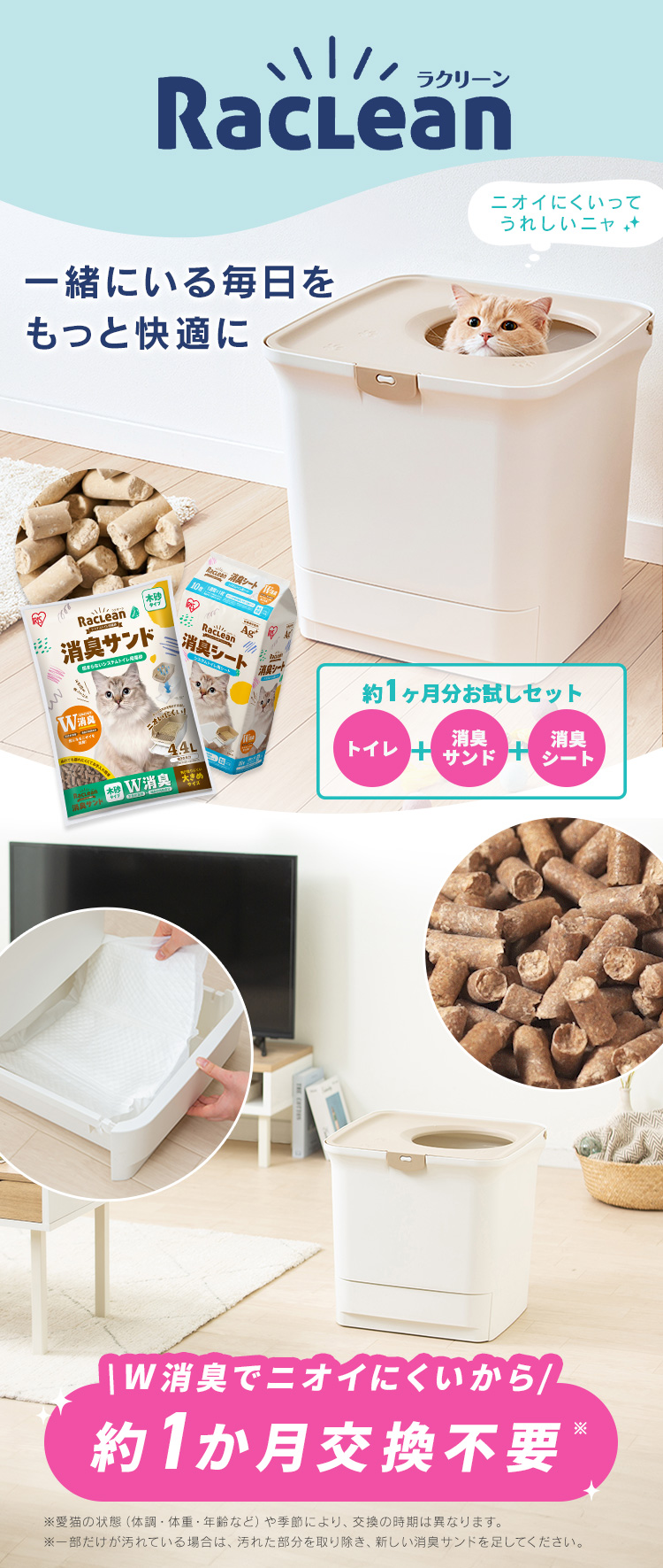 「ラクリーン 消臭システムトイレ 上からタイプ」+「消臭サンド」+「消臭シート」の組み合わせで、気になるにおいを抑える画期的な猫用システムトイレです。◆サンドとシートでW消臭!