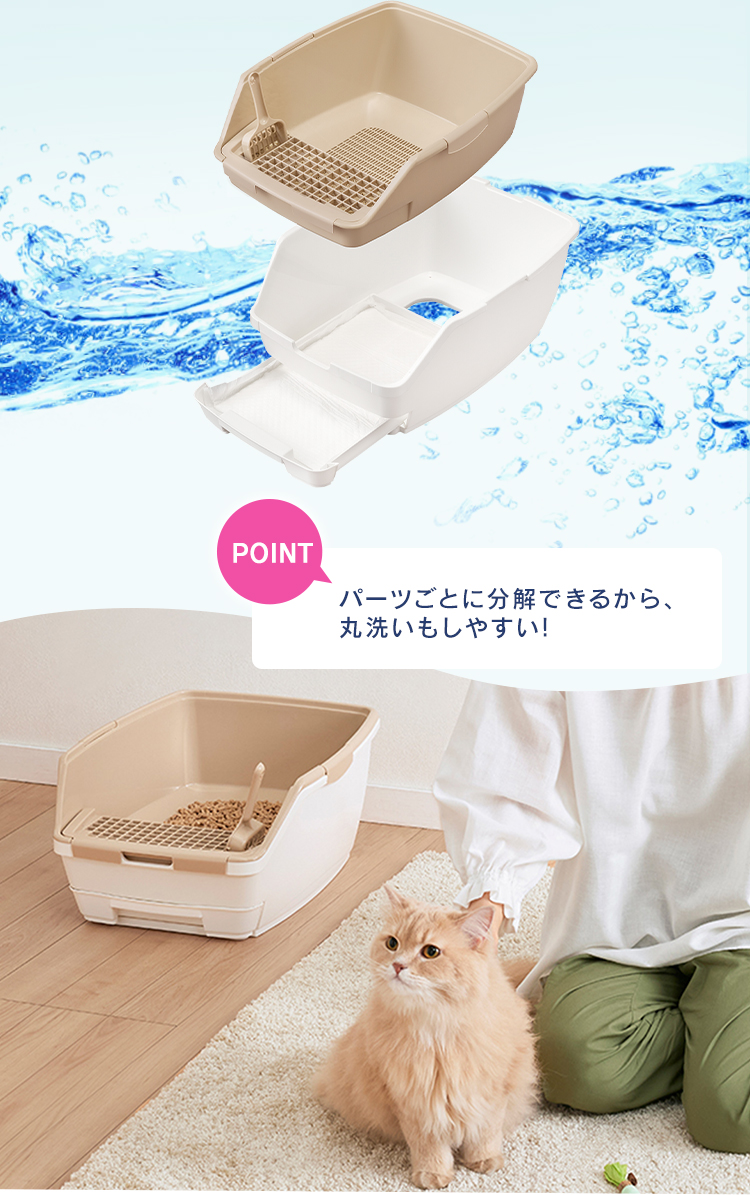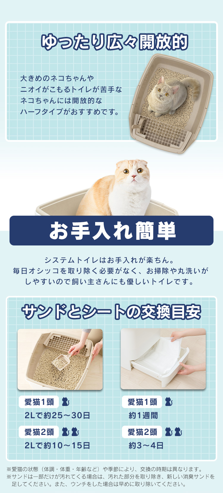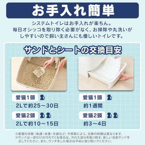 「ラクリーン 消臭システムトイレ オープンタイプ」+「消臭サンド」+「消臭シート」の組み合わせで、気になるにおいを抑える猫用システムトイレです。