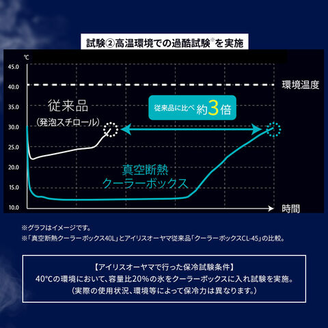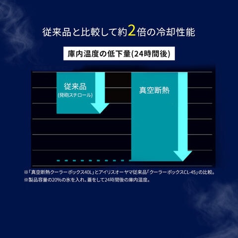 (※保冷試験条件:容量比40%の氷をクーラーボックスに入れ[30℃:9時間/20℃:15時間]で保管後に氷重量を測定。氷が溶け切るまでの時間を算出[社内試験結果]。実際の使用状況、環境等によって保冷力は異なります。)
