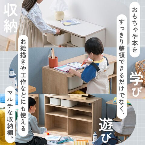 おもちゃや本をすっきり整頓できるだけでなく、お絵描きや工作などにも使えるマルチな収納棚。