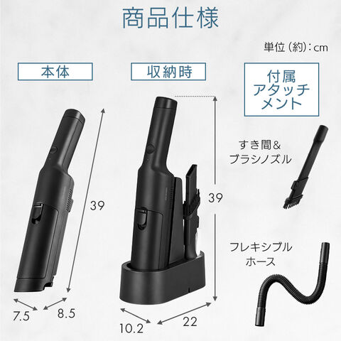 すき間ノズル、フレキシブルホース、充電スタンド、充電アダプター、使い捨てダストパック×24枚(1枚は本体内にセット済み)