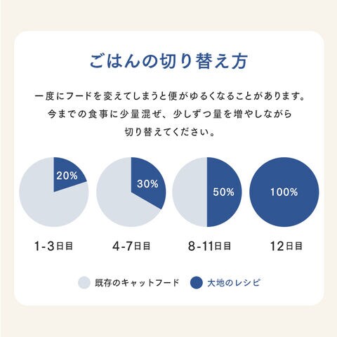 今までの食事に少量混ぜ、少しずつ量を増やしながら切り替えてください。