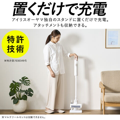 充電スタンド付きなので、お掃除が終わったらスタンドに置くだけで充電でき、アタッチメントも収納できます。