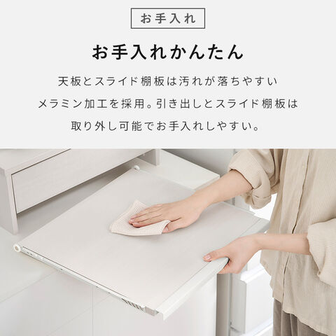 引き出しとスライド棚板は取り外し可能で、お手入れしやすい。