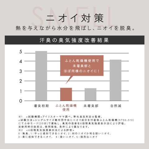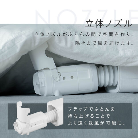 アイリスオーヤマ独自の立体ノズルが、ふとんを持ち上げて空間をつくることにより、より速くすみずみまで風を届けます。