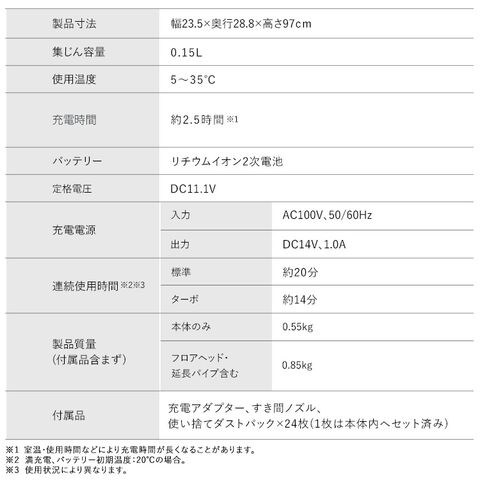 充電アダプター、すき間ノズル、使い捨てダストパック×24枚(1枚は本体内にセット済み)