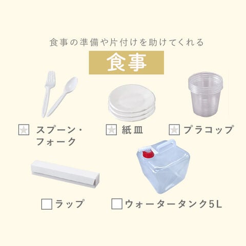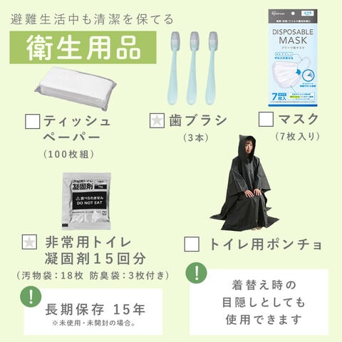 物資供給やライフラインが復旧するまでの生活をサポートするため、睡眠環境や排泄、衛生面などに配慮した用品を備えています。
