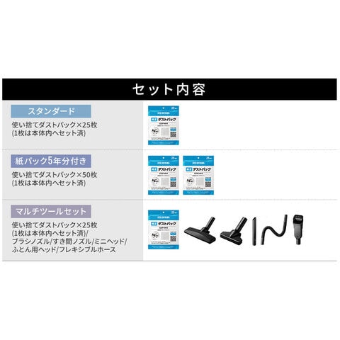 充電アダプター、充電スタンド、静電モップ、モップ帯電ケース、すき間ノズル、使い捨てダストパック×25枚(1枚は本体内にセット済み)